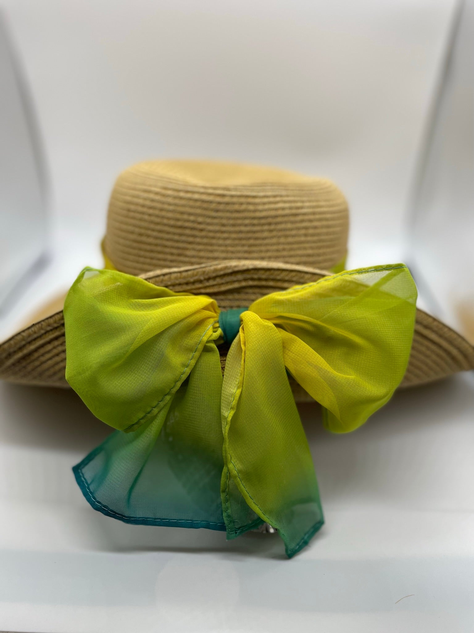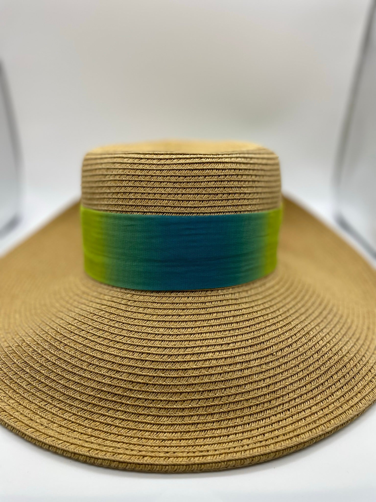 Days in St. Lucia call for the most stylish accessories and this woven straw hat will be a true showstopper! The St. Lucia Sun hat's brim has a slight lampshade shape and a curled back brim finished with a cute bow. The hat band is a sheer gradient blue green combination that adds flair to any outfit. The brim is 4 inches and provides great shade (UPF 50+) for even the sunniest days. Inside you will find an adjustable drawstring for a great fit.